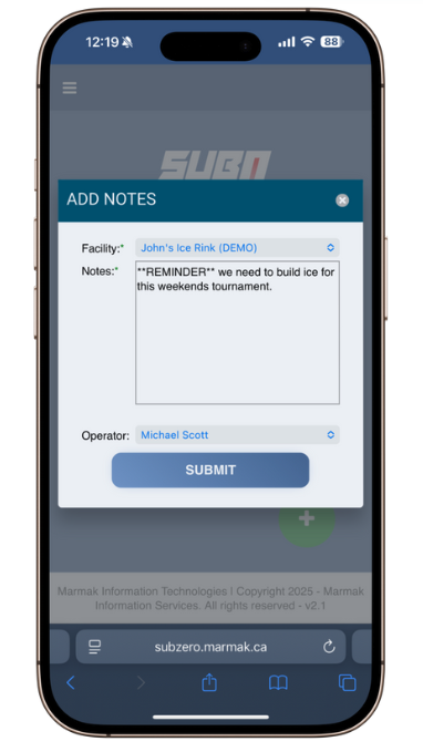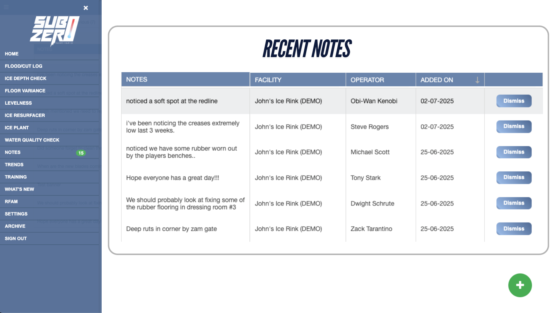 No more whiteboards with messy handwriting. Gone are the days of missing key information because comments were erased before everyone got to see them. SUB-ZERO's new operational log - NOTES, keeps all your rink updates in one place for all staff to see and monitor. This is extremely valuable for organizations that manage multiple facilities, this new feature keeps everyone up to speed from operators all the way to management.